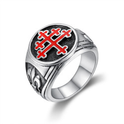 Chevalière Bague Ronde Croix Rouge Acier 316L Templier Franc-maçonnerie In Hoc Signo Vinces Argenté